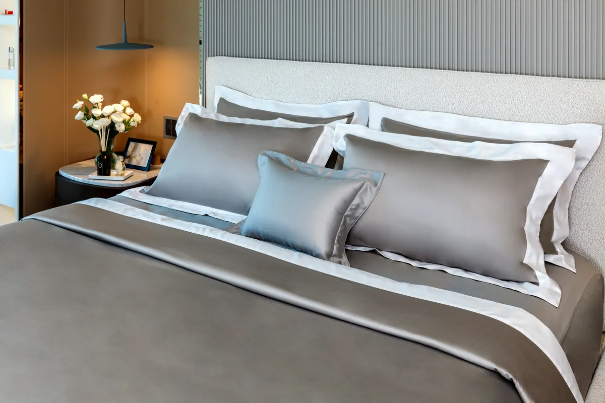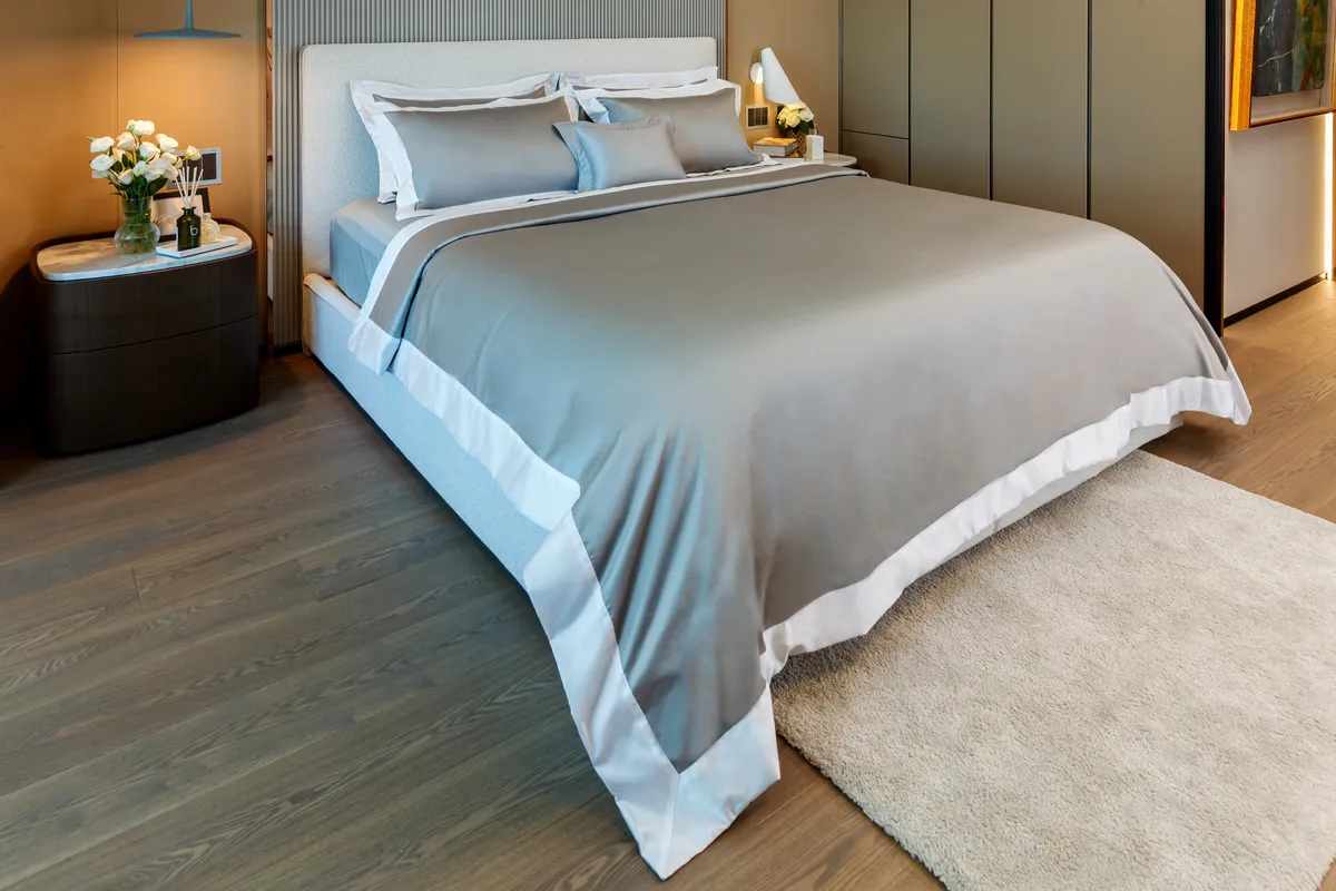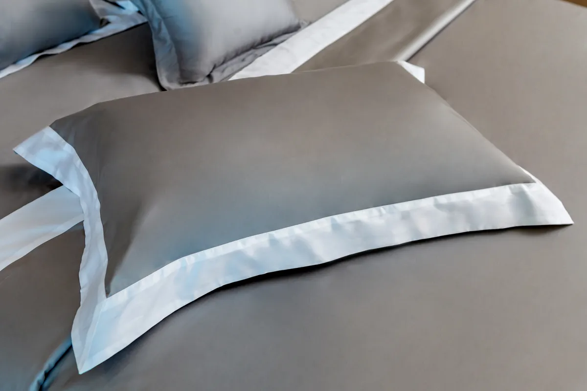 枕套及被套單品以白色邊框點綴沉穩灰色,打造經典英式風格寢具。