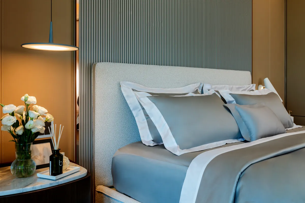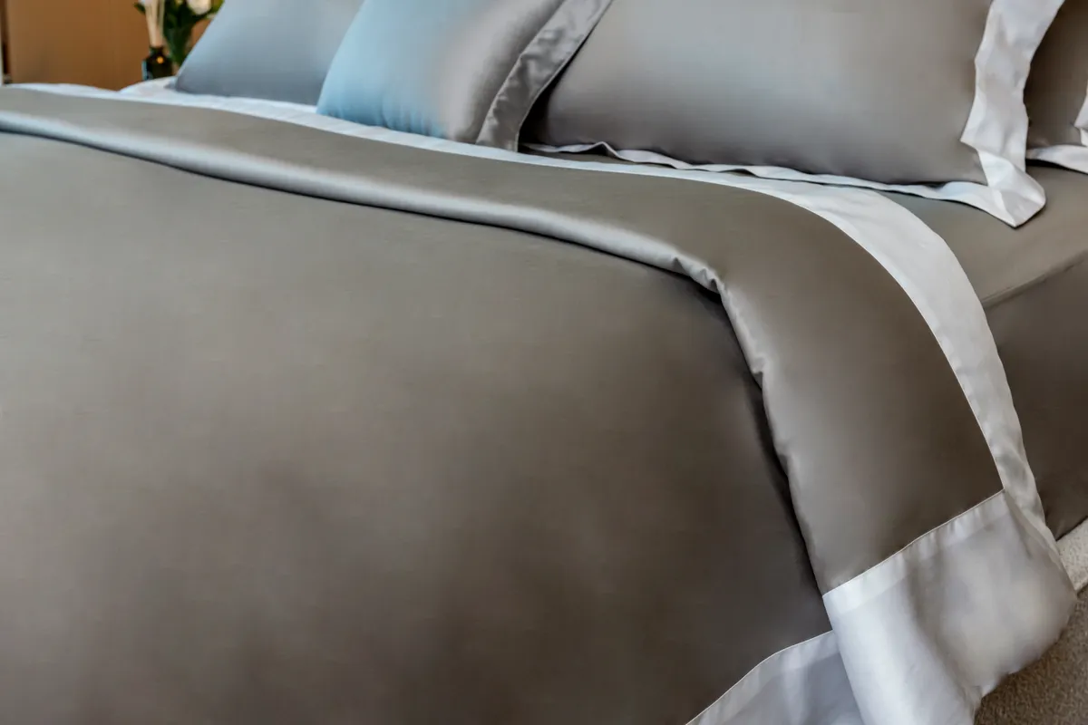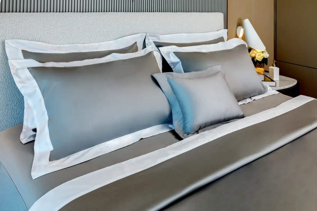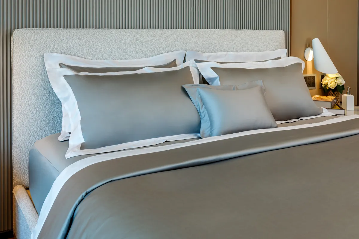 枕套及被套單品以白色邊框點綴沉穩灰色,打造經典英式風格寢具。