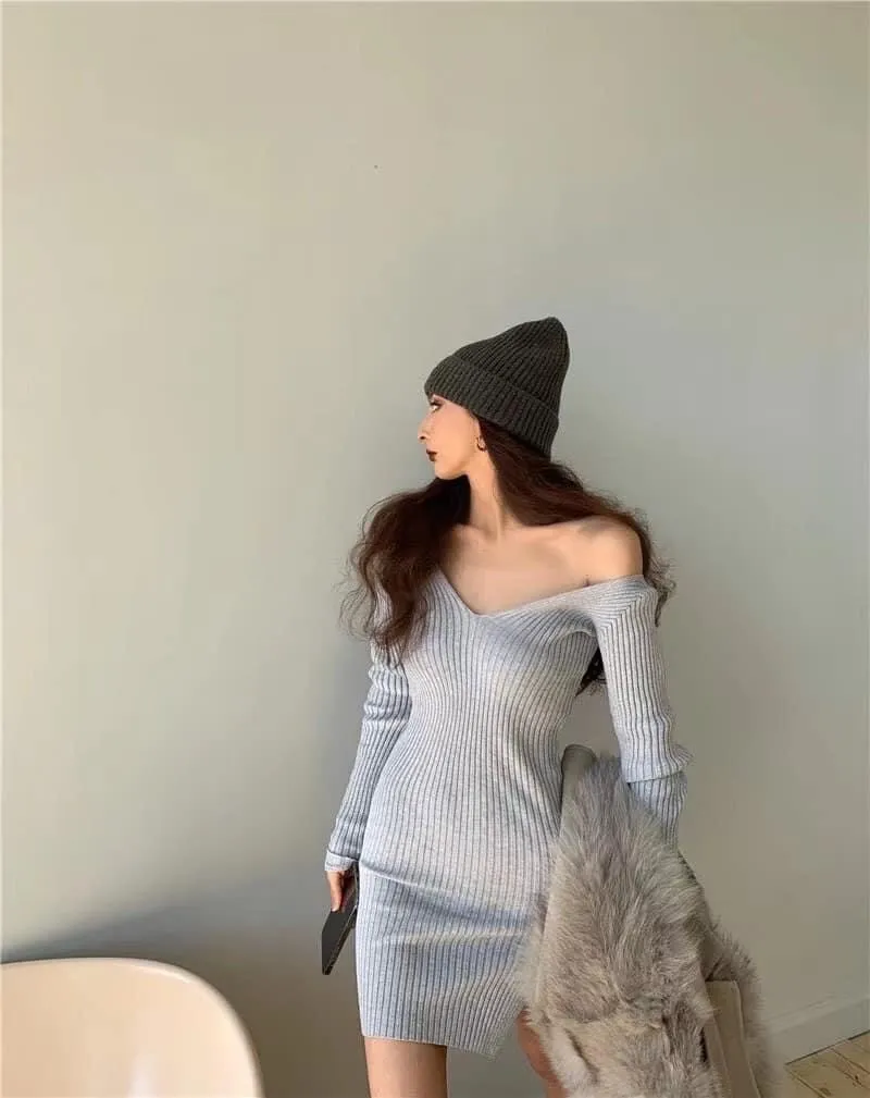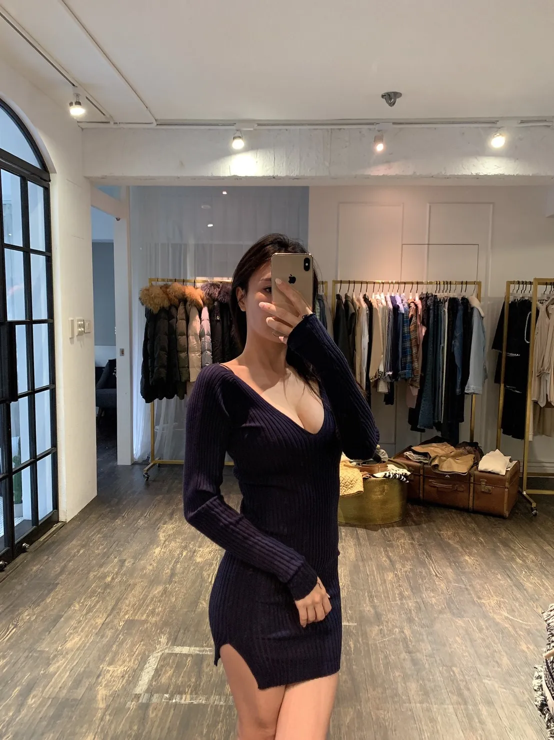 彈性針織貼身顯身材,大V領和側邊小開岔設計十分性感,