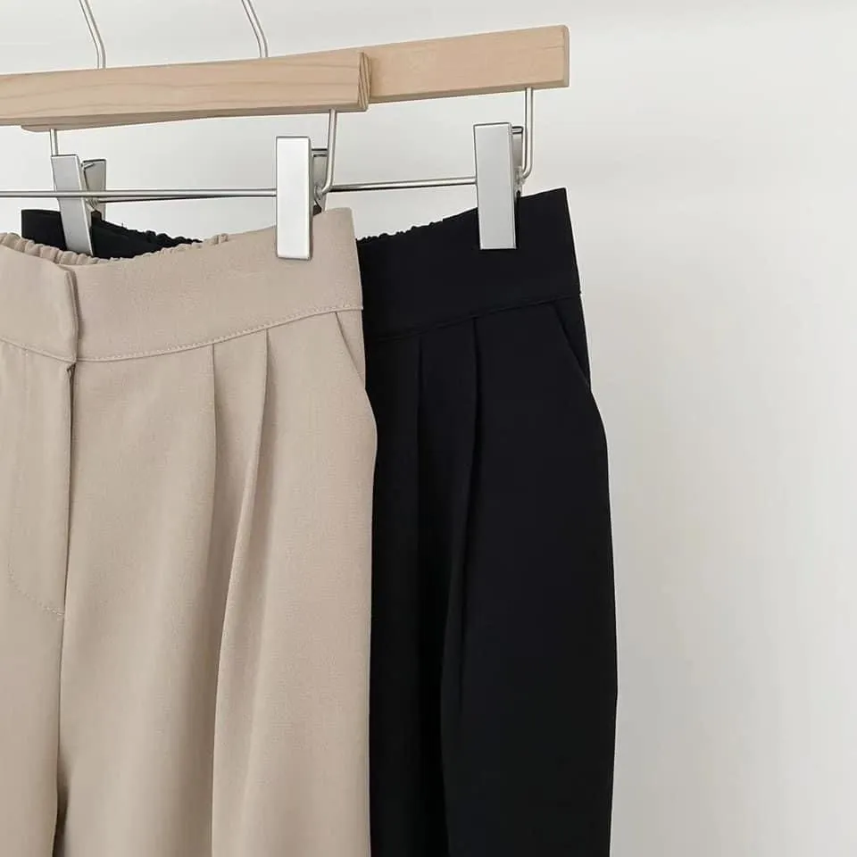 前腰有扣子,後腰有鬆緊帶,大腿兩側有口袋,褲腳縮口。