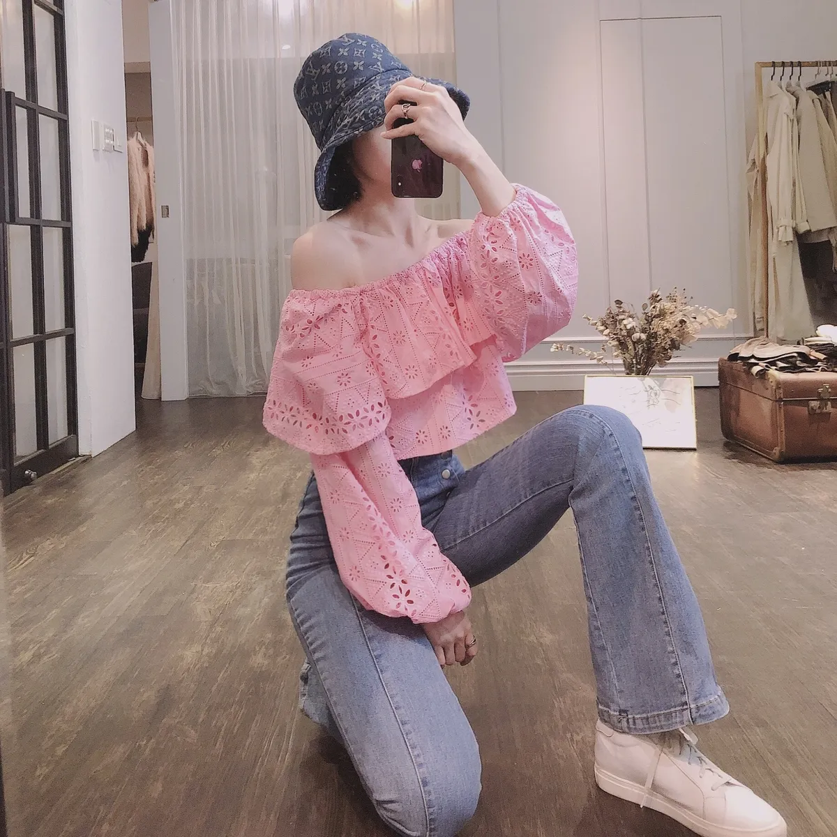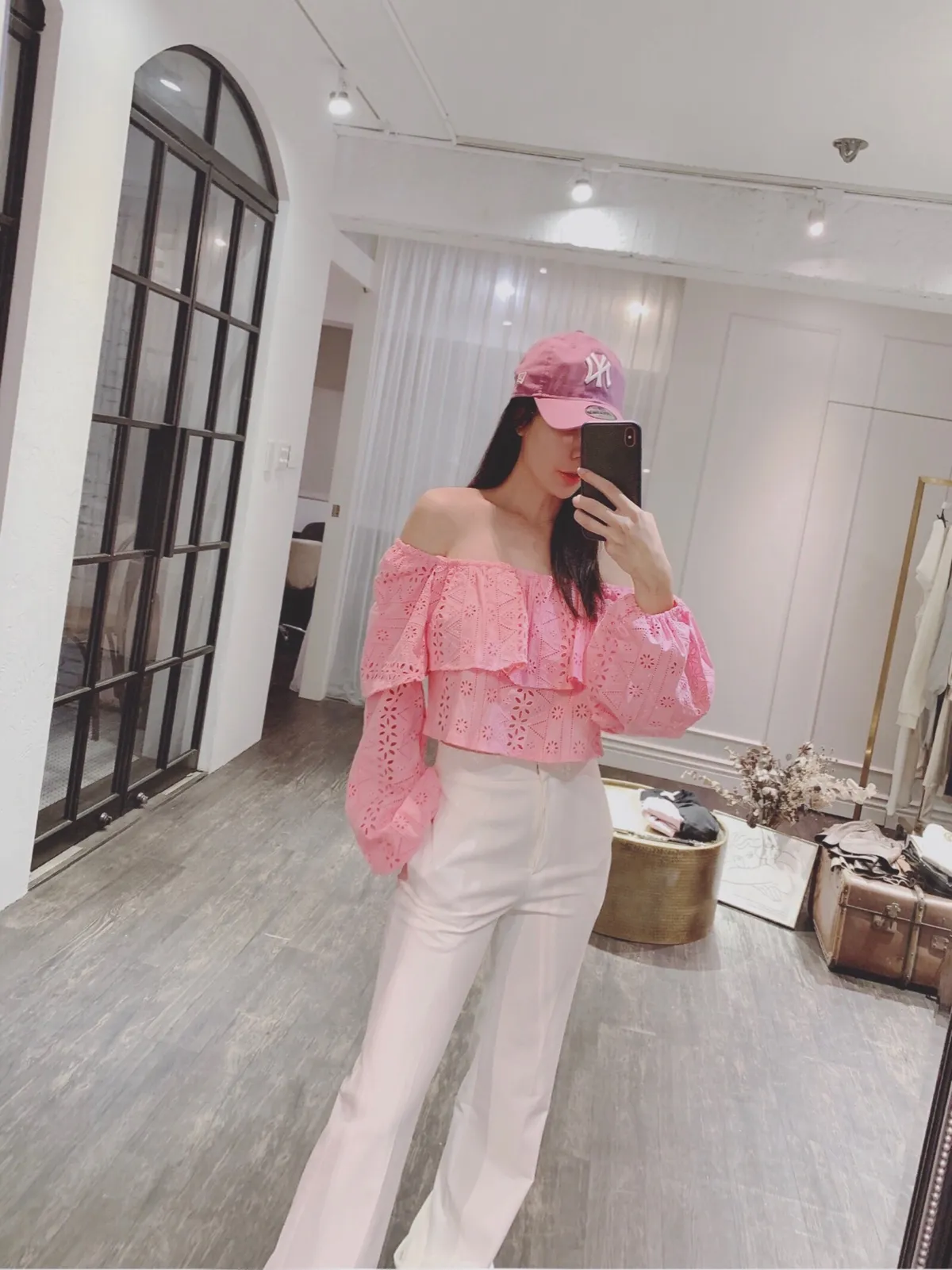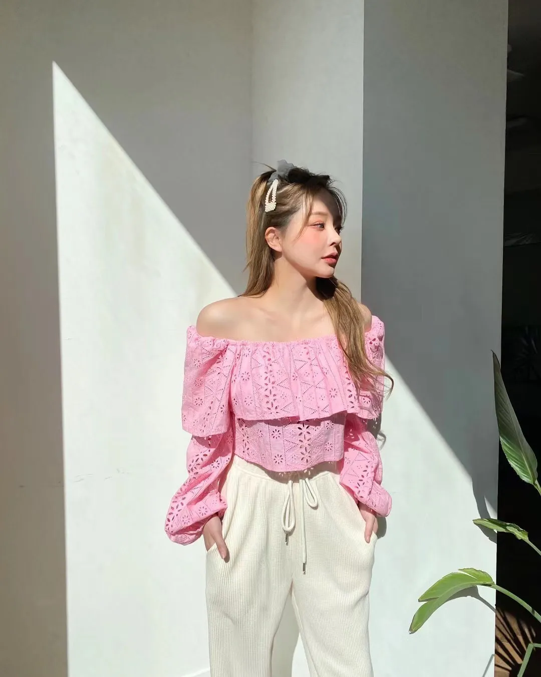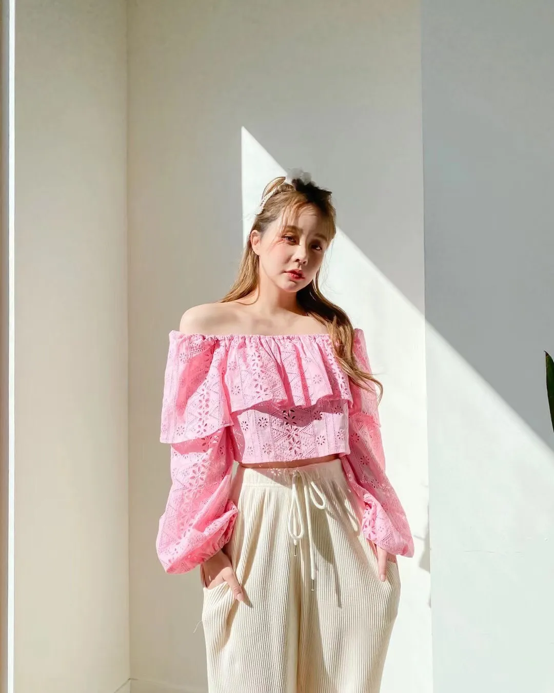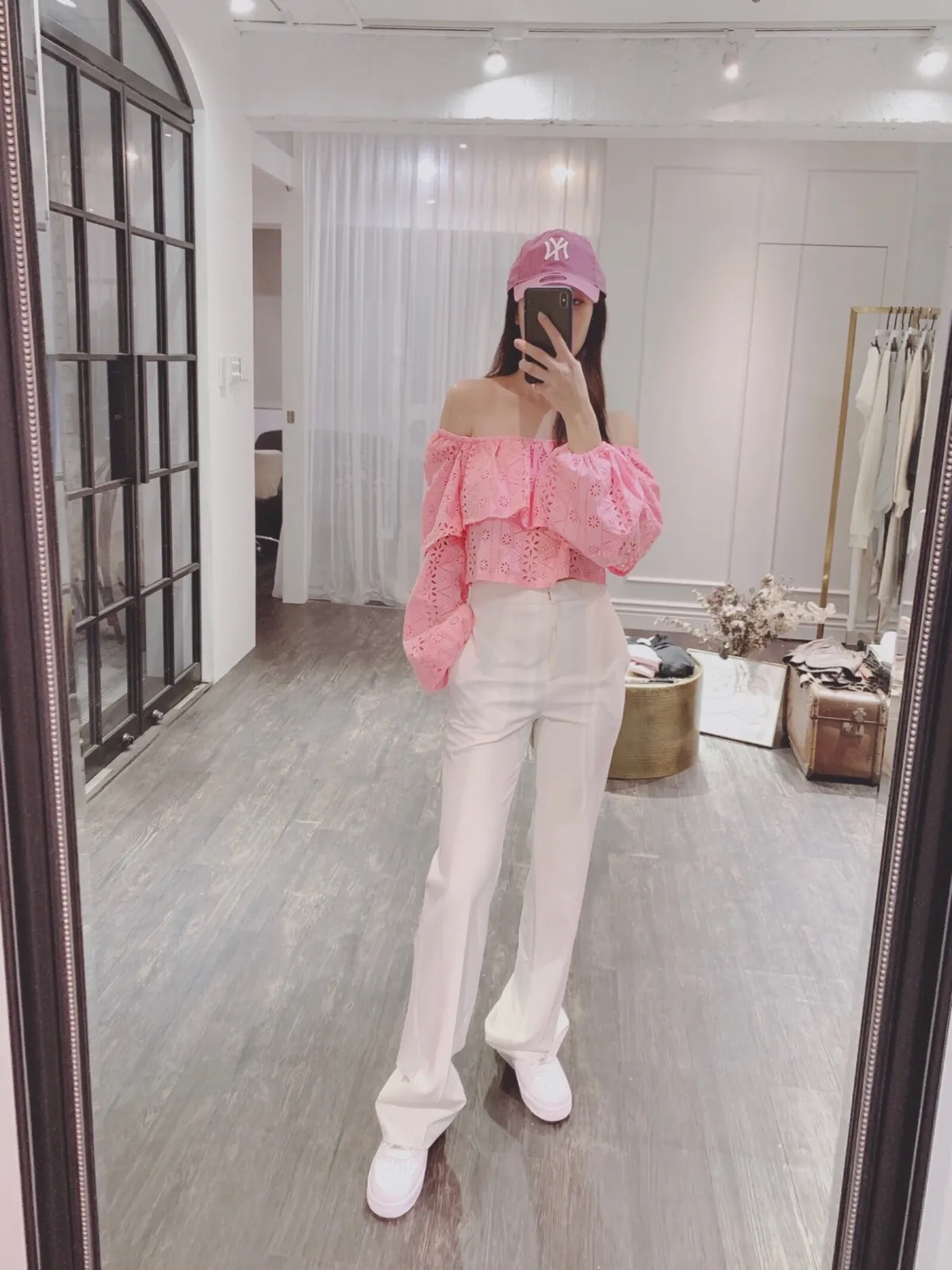 細緻提花配荷葉澎袖,減齡造型還遮手臂肉,