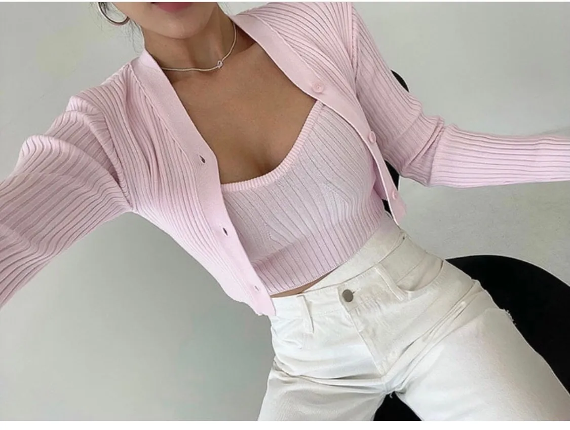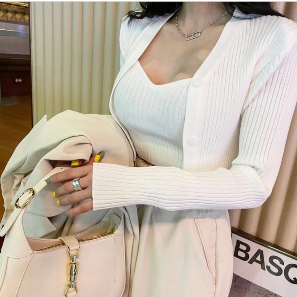 垂直織紋的坑條設計在視覺上拉長身材比例又顯胸,